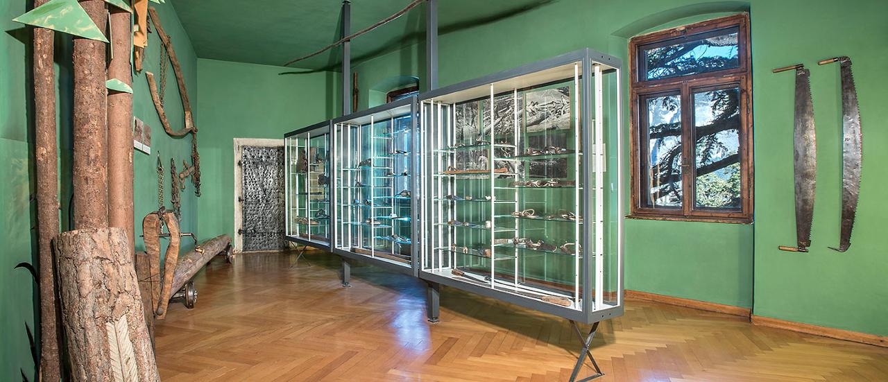 La buona gestione dei boschi di alto fusto una caratteristica storica fondamentale della vita delle comunit trentine. Nella sala presentata la strumentazione essenziale per il lavoro del bosco.