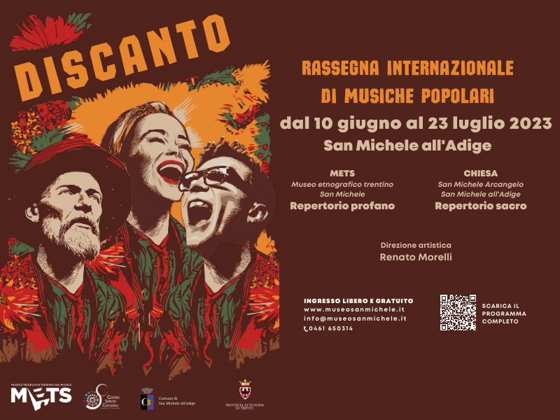 Nella sede museale di San Michele a partire da sabato 10 giugno e fino a domenica 23 luglio, nell’antico chiostro agostiniano e nella Chiesa di San Michele Arcangelo si potranno ascoltare musiche tradizionali polivocali - rispettivamente profane e liturgico-spirituali - provenienti da Georgia, Corsica, Lombardia, Sardegna, Friuli Venezia Giulia e Trentino. Un itinerario ragionato mirato alla scoperta o riscoperta di tradizioni millenarie e delle nostre stesse radici musicali. La rassegna internazionale, che gode della direzione artistica di Renato Morelli, si caratterizza per una peculiare novità vale a dire la presentazione di repertori polifonici tradizionali “a cappella” nel loro duplice aspetto: profano e liturgico-spirituale. “Discanto”, rassegna internazionale di musica profana e sacra è sostenuta interamente dal Centro Servizi Culturali Santa Chiara e si svolge in collaborazione con il Comune di san Michele all’Adige. Le esibizioni dei gruppi polivocali sono in programma il sabato alle 21.00 e la domenica alle 11.30 tranne il 18 giugno che si anticipa di un’ora, alle 10.30. L’ingresso è libero e gratuito. Ampia possibilità di parcheggio nelle vicinanze del Museo e della Chiesa di San Michele Arcangelo.