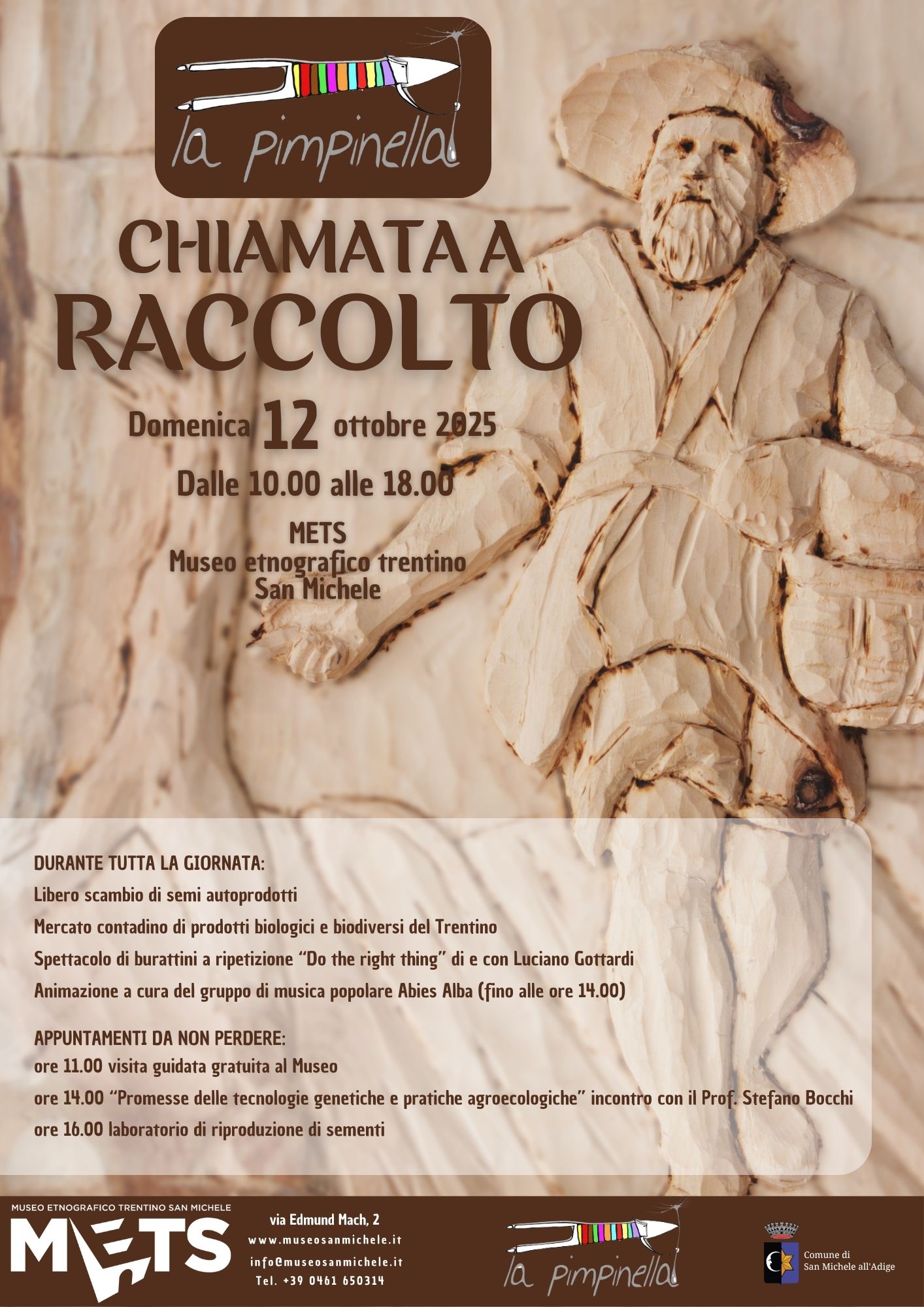 Domenica 12 ottobre al METS torna “Chiamata a raccolto”, una giornata dedicata alla biodiversità agricola e al libero scambio di semi organizzata dall’Associazione per la tutela della biodiversità agricola - La Pimpinella. Dalle 10.00 alle 18.00 sarà possibile partecipare a un evento che mira a preservare e condividere antiche tradizioni legate alla coltivazione. Si potrà, inoltre, fare acquisti nel ricco mercato contadino, dove saranno disponibili prodotti biologici provenienti da tutto il territorio trentino.