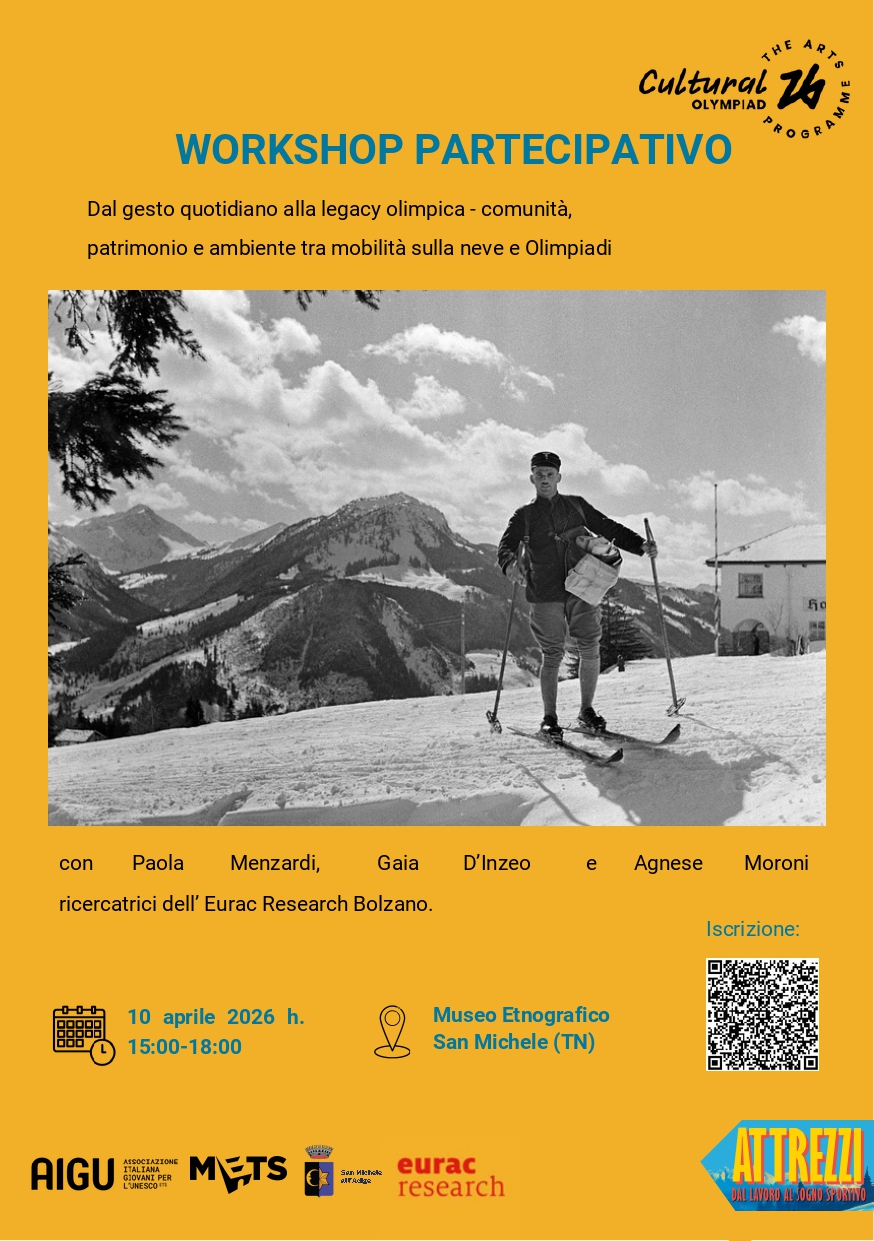 Il METS venerdì 10 aprile 2026 dalle ore 15.00 alle 18.00 ospita il workshop partecipativo “Dal gesto quotidiano alla legacy olimpica – comunità, patrimonio e ambiente tra mobilità sulla neve e Olimpiadi”. L’iniziativa, promossa dall’Associazione Italiana Giovani per l’UNESCO (AIGU) in collaborazione con Eurac Research, si ricollega alla mostra, organizzata dal METS, "Attrezzi. Dal lavoro al sogno sportivo", dedicata alle Olimpiadi e Paralimpiadi Invernali Milano–Cortina 2026.
