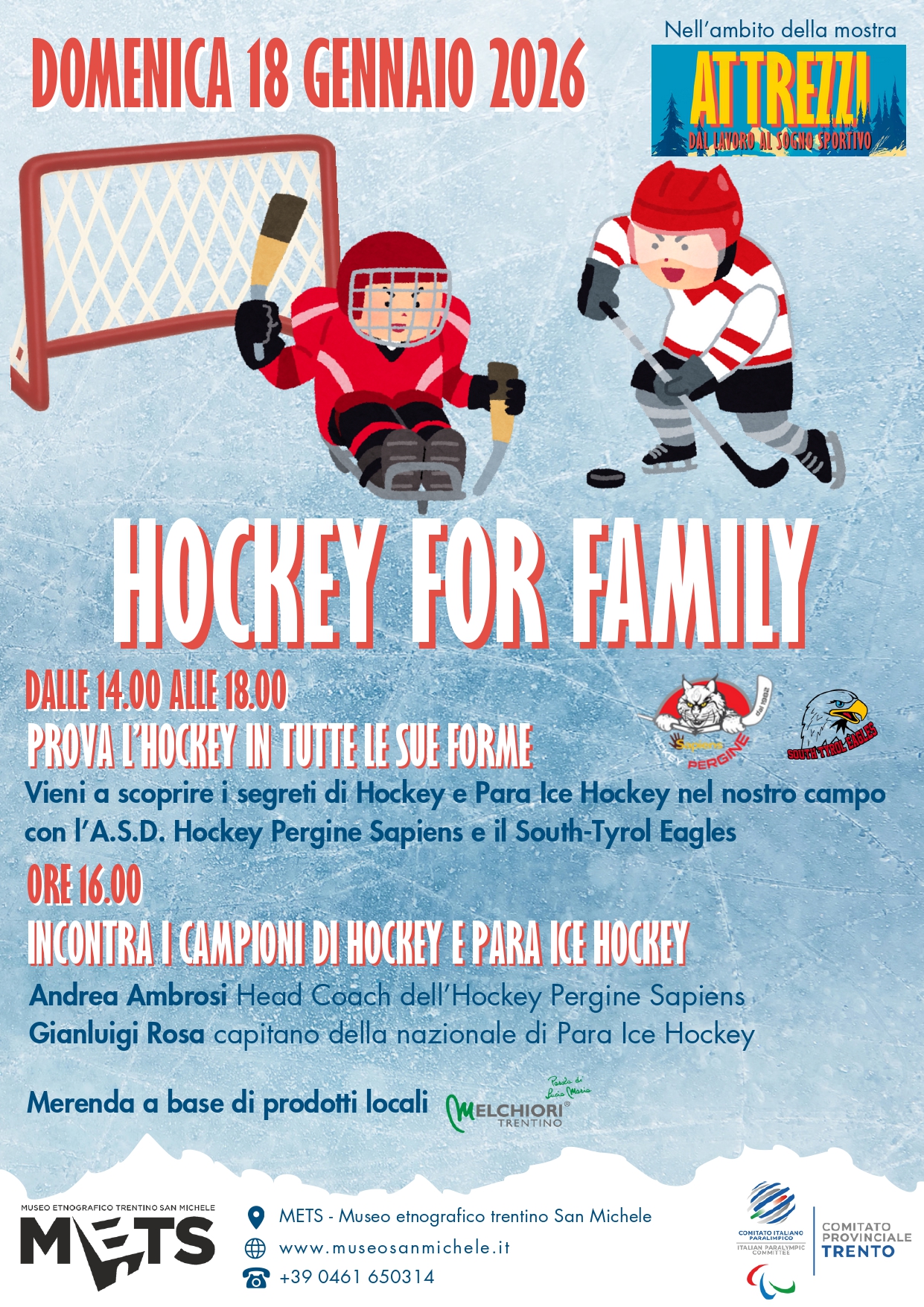 Un pomeriggio dedicato a famiglie e bambini, in compagnia di Andrea Ambrosi, allenatore dell’Under 18 della Nazionale Italiana e Head Coach dell’Hockey Pergine Sapiens, e Gianluigi Rosa, capitano della Nazionale di Para Ice Hockey e giocatore della South Tyrol Eagles.