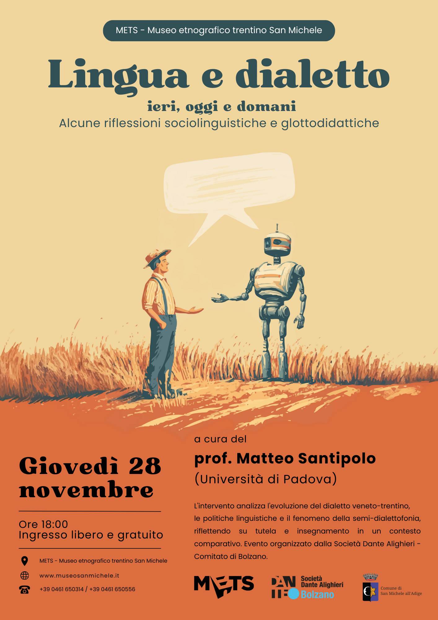 Giovedì 28 novembre, alle ore 18:00, il METS - Museo etnografico trentino San Michele, in collaborazione con la Società Dante Alighieri – Comitato di Bolzano, ospiterà l’incontro "Lingua e dialetto ieri, oggi e domani. Alcune riflessioni sociolinguistiche e glottodidattiche", tenuto dal professor Matteo Santipolo, una delle figure di riferimento nel campo della didattica delle lingue moderne e della sociolinguistica.