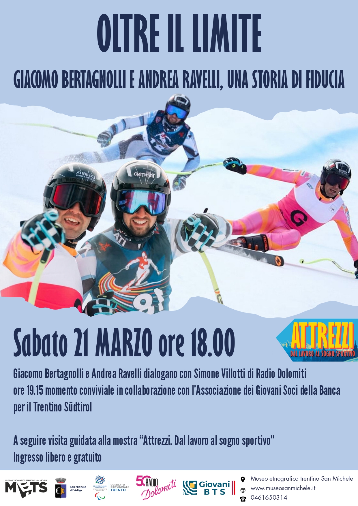 Sabato 21 marzo 2026 alle ore 18, a pochi giorni dalla chiusura della XIV edizione dei Giochi Paralimpici Invernali di Milano Cortina 2026, il METS ospita l’ultimo appuntamento del ricco programma culturale della mostra “Attrezzi. Dal lavoro al sogno sportivo”: “Oltre il limite. Giacomo Bertagnolli e Andrea Ravelli: una storia di fiducia”.