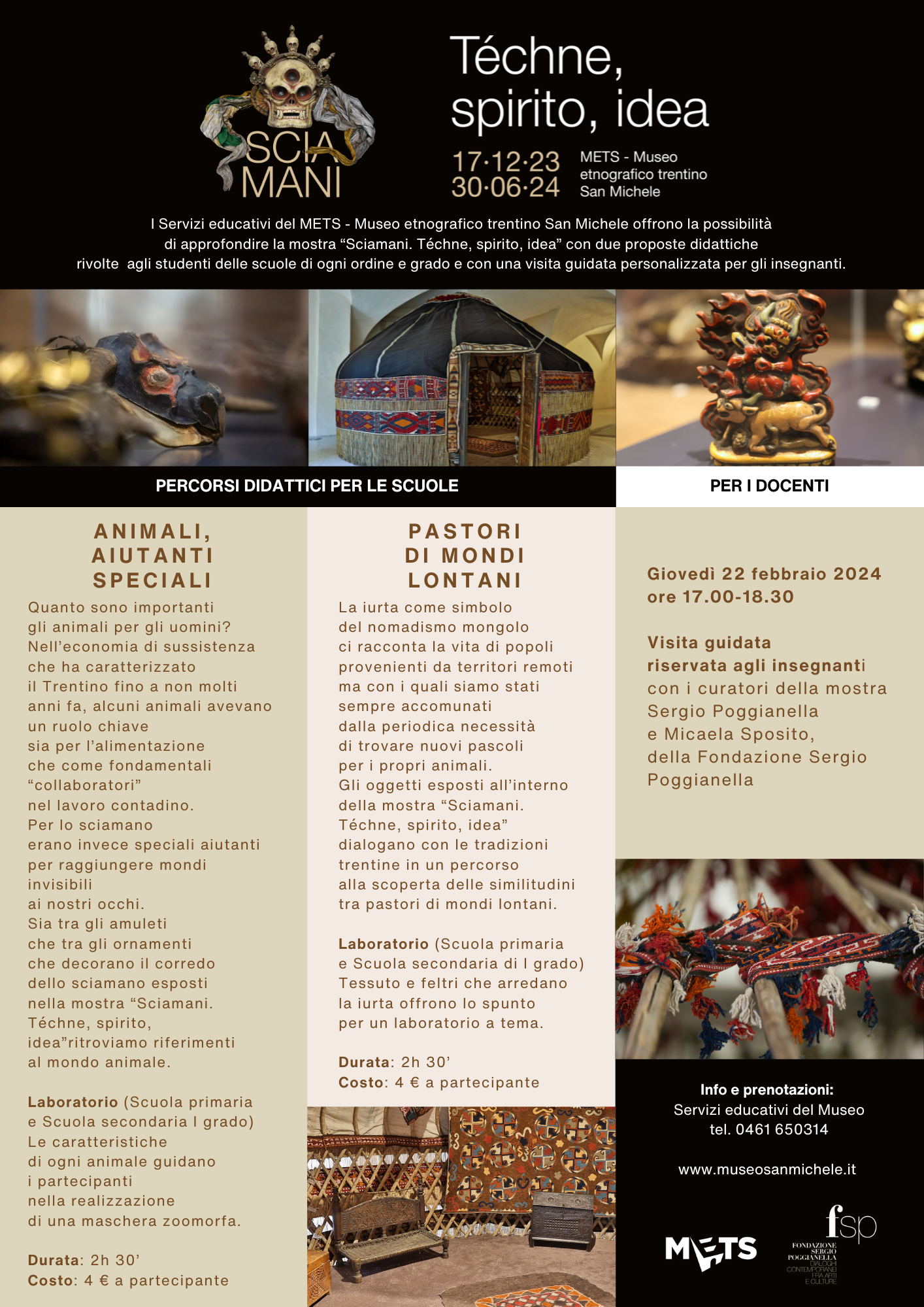 I Servizi educativi del METS - Museo etnografico trentino San Michele offrono la possibilità di approfondire la mostra “Sciamani. Téchne, spirito, idea” con due proposte didattiche rivolte agli studenti delle scuole di ogni ordine e grado e con una visita guidata personalizzata per gli insegnanti.