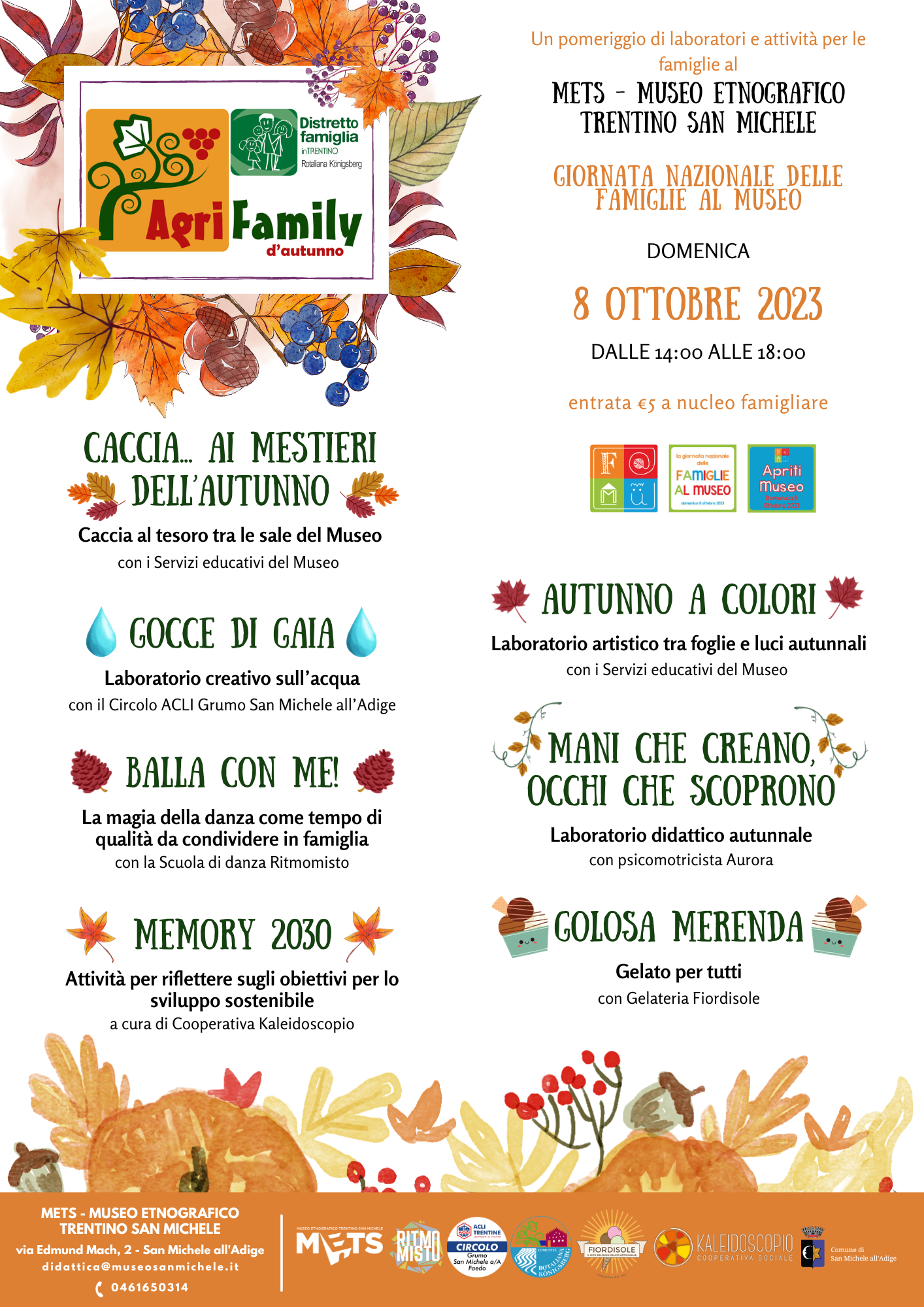 Al METS-Museo etnografico trentino San Michele il pomeriggio di domenica 8 ottobre è dedicato ai bambini e alle famiglie con una serie di iniziative “su misura”. La proposta “Agrifamily d’autunno” è nata in collaborazione con il Distretto Famiglia Rotaliana Königsberg. Dalle 14.00 fino alle 18.00 il Museo ospiterà enti e associazioni ‘family friendly’ della Piana Rotaliana che animeranno sale espositive e aule didattiche con attività che coinvolgeranno bambini e famiglie: danza, arte, ecologia, con spazio alla creatività e alla didattica. Costo dell’entrata 5 euro a nucleo familiare. Si potrà gustare una gustosa merenda con i prelibati gelati della gelateria Fiordisole.