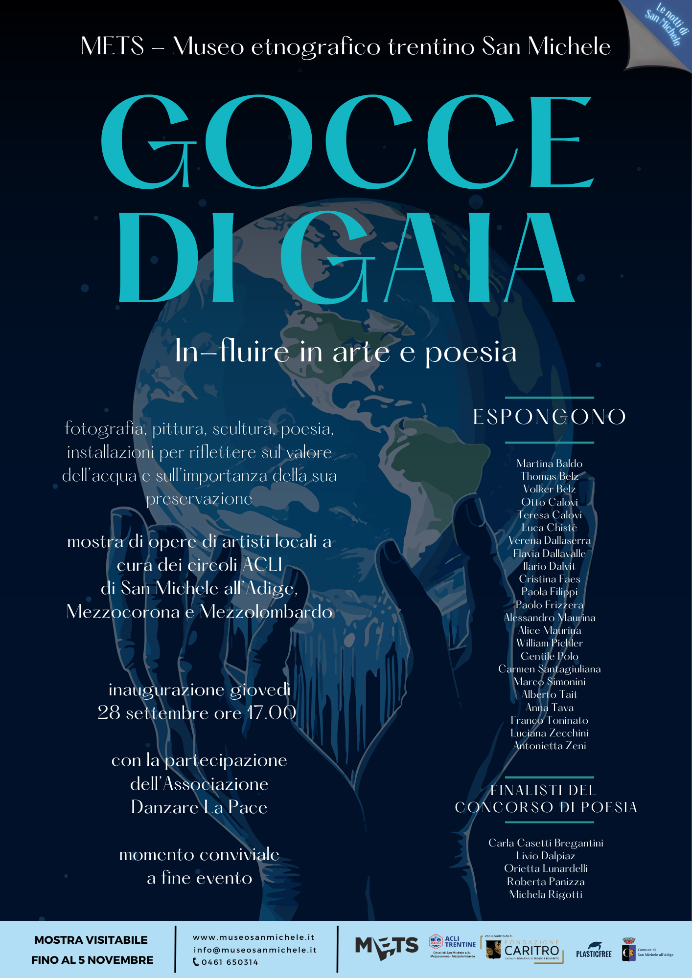 “Gocce di Gaia. In-fluire in arte e poesia” che si inaugurerà giovedì 28 settembre alle 17.00 al METS- Museo etnografico trentino San Michele è un’esposizione di opere di artisti locali sul tema dell’acqua, fonte primaria di vita, risorsa fondamentale da non sprecare e da non inquinare, elemento chiave in tutte le culture. Le opere esprimono i diversi modi di vedere l’acqua attraverso gli occhi degli artisti, e la loro personale forma d’arte, fotografia, pittura, scultura. Abbinato alla mostra c’è un concorso di poesia sul tema “acqua” e una installazione con il coinvolgimento diretto dei visitatori per riflettere sul valore dell’acqua e sull’importanza della sua preservazione. L’iniziativa fa parte del ricco programma de “Le Notti di San Michele”. All’inaugurazione parteciperà l’Associazione Danzare La Pace. L’evento si concluderà con un momento conviviale.