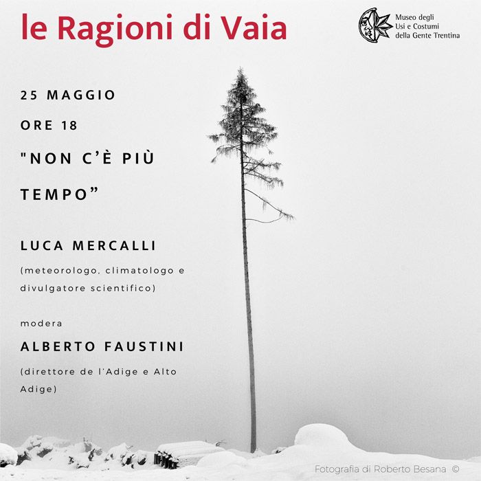 Comincerà mercoledì 25 maggio alle 18 in Sala Conferenze al Museo degli Usi e Costumi della Gente Trentina la prima conferenza del ciclo “le Ragioni di Vaia”. Luca Mercalli con “Non c’è più tempo”, proporrà un’analisi particolarmente attuale. In conversazione con il direttore dei quotidiani l’Adige e Alto Adige, Alberto Faustini, il meteorologo, climatologo e divulgatore scientifico, esporrà le sue tesi e le sue considerazioni partendo dall’evento meteorologico estremo - poi denominato Tempesta Vaia - che, alla fine di ottobre 2018, sconvolse un vastissimo territorio alpino del nord est italiano. Un focus etnografico connetterà il tema proposto nella conferenza con un oggetto delle ricche collezioni museali. L’entrata a tutti gli appuntamenti del ciclo “le Ragioni di Vaia” è libera e gratuita. A coloro che decideranno di partecipare a una o più conferenze del ciclo “le Ragioni di Vaia”, il Museo offre un biglietto d’entrata alla tariffa speciale di 1 € - da usare entro il 29 ottobre - per visitare le collezioni e vivere l’esperienza sonora “i Suoni di Vaia”.