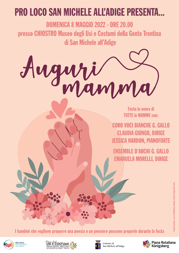 Domenica 8 maggio alle 20.00 nel chiostro del Museo degli Usi e Costumi della Gente Trentina la Pro loco di San Michele celebra le mamme con un concerto che vedrà protagonisti i bambini del Coro di voci bianche della Scuola Musicale Guido Gallo, diretti dalla Maestra Claudia Giongo e accompagnati al pianoforte dalla Maestra Jessica Nardon, e l’ensemble d’archi Guido Gallo, diretto dalla Maestra Emanuela Morrelli.