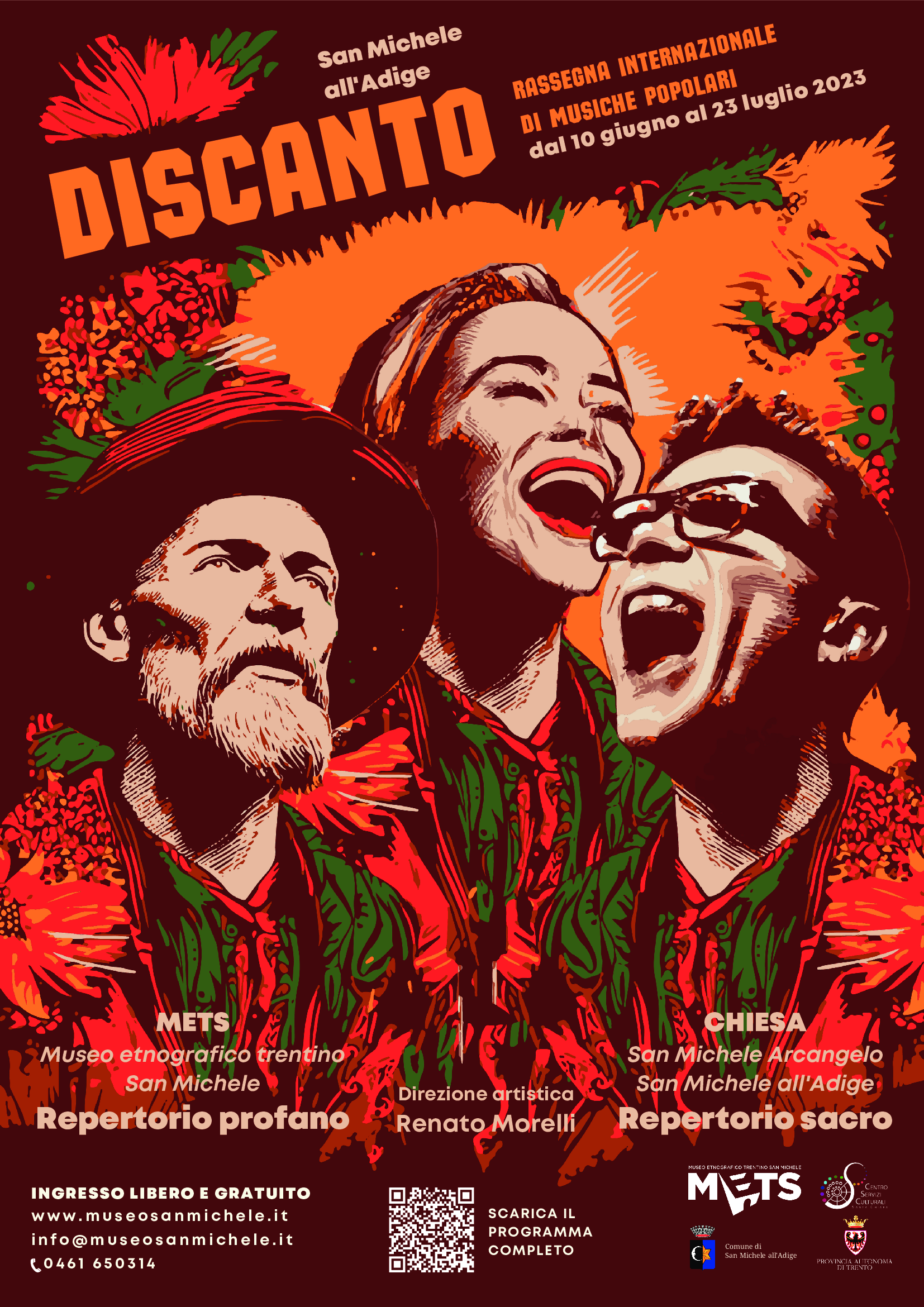 Nella sede museale di San Michele a partire da sabato 10 giugno e fino a domenica 23 luglio, nell’antico chiostro agostiniano e nella Chiesa di San Michele Arcangelo si potranno ascoltare musiche tradizionali polivocali - rispettivamente profane e liturgico-spirituali - provenienti da Georgia, Corsica, Lombardia, Sardegna, Friuli Venezia Giulia e Trentino. Un itinerario ragionato mirato alla scoperta o riscoperta di tradizioni millenarie e delle nostre stesse radici musicali. La rassegna internazionale, che gode della direzione artistica di Renato Morelli, si caratterizza per una peculiare novità vale a dire la presentazione di repertori polifonici tradizionali “a cappella” nel loro duplice aspetto: profano e liturgico-spirituale. “Discanto”, rassegna internazionale di musica profana e sacra è sostenuta interamente dal Centro Servizi Culturali Santa Chiara e si svolge in collaborazione con il Comune di san Michele all’Adige. Le esibizioni dei gruppi polivocali sono in programma il sabato alle 21.00 e la domenica alle 11.30 tranne il 18 giugno che si anticipa di un’ora, alle 10.30. L’ingresso è libero e gratuito. Ampia possibilità di parcheggio nelle vicinanze del Museo e della Chiesa di San Michele Arcangelo.