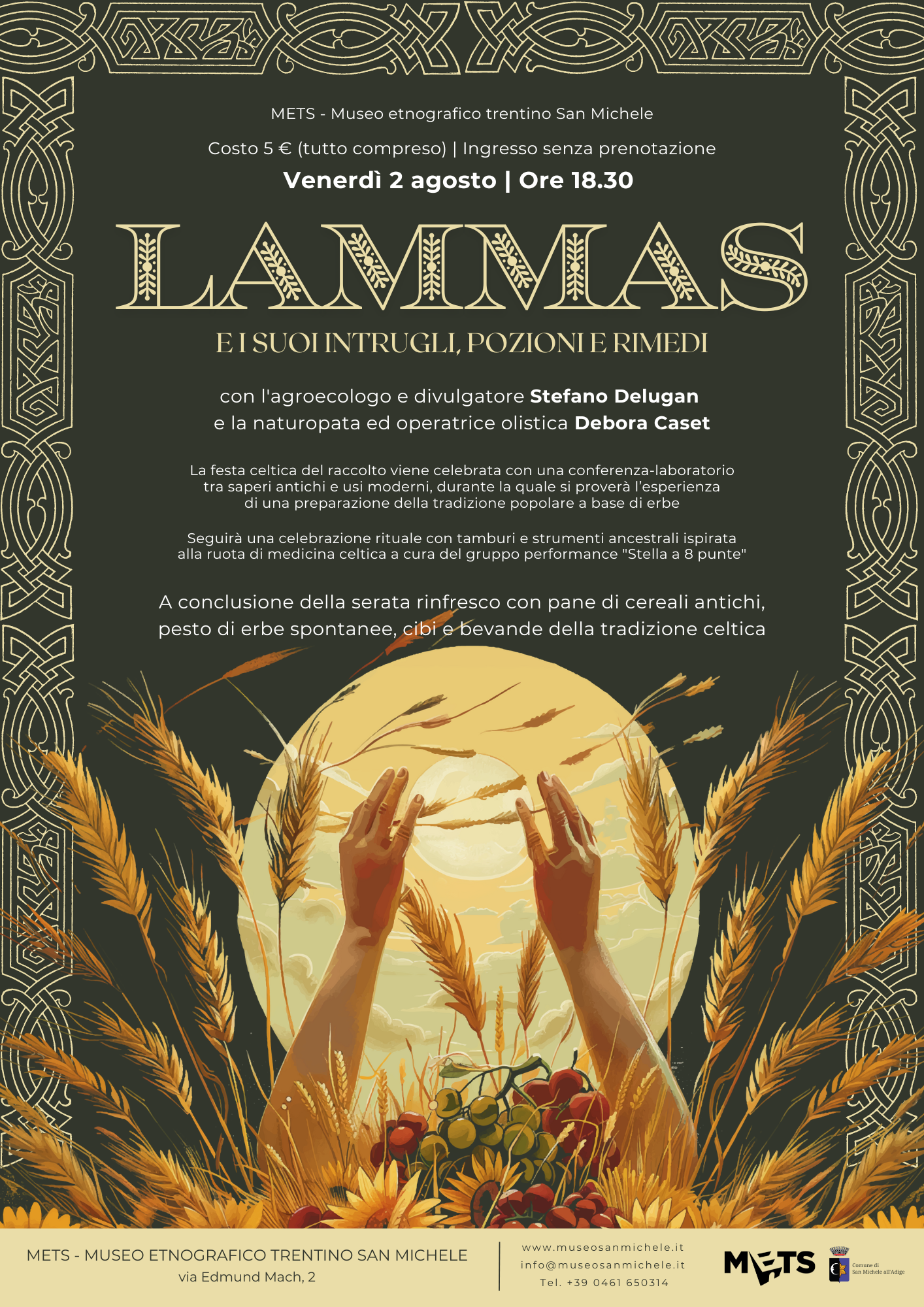 Venerdì 2 agosto, alle ore 18.30, al METS si terrà un evento dedicato alla festa celtica del raccolto, Lammas, con l'agroecologo e divulgatore Stefano Delugan e la naturopata e operatrice olistica Debora Caset. La serata prevede una conferenza-laboratorio tra saperi antichi e usi moderni, con l'esperienza pratica di preparazioni della tradizione popolare a base di erbe.