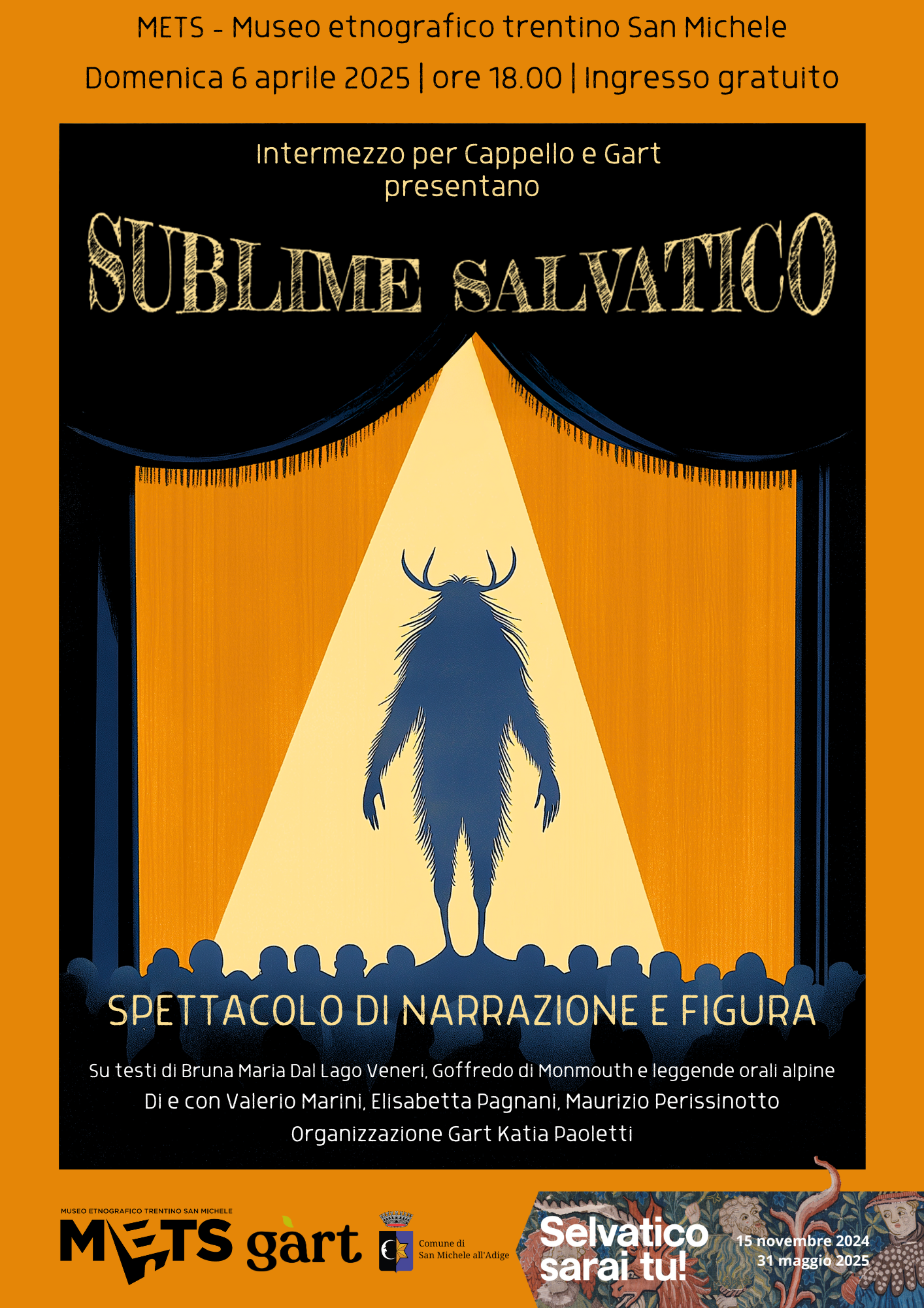 Sabato 6 aprile 2025 alle ore 18 il METS - Museo etnografico trentino San Michele, in collaborazione con Gart-GardenArt aps, ospiterà lo spettacolo di narrazione e figura “Sublime salvatico” a cura di Intermezzo per cappello, di e con Valerio Marini, Elisabetta Pagnani, Maurizio Perissinotto. La rappresentazione scenica ha preso ispirazione da varie fonti: dalle ricerche etnografiche di Bruna Maria Dal Lago Veneri e Giuseppe Šebesta alla narrativa medievale di Goffredo di Monmouth, dalle numerose leggende legate alla figura dell’Uomo Selvatico alla letteratura fiabesca. Inserita a chiusura del percorso artistico-didattico “Il teatro di figura racconta l’Uomo Selvatico” nell’ambito della mostra “Selvatico sarai tu!”, si propone come una forma spettacolare ibrida, una messinscena asciutta ed essenziale dove il teatro di narrazione, marionette, kamishibai, maschere e ombre si mescolano e si intrecciano fondandosi sulla tecnica, tanto semplice quanto antica, del “racconto nel racconto”.