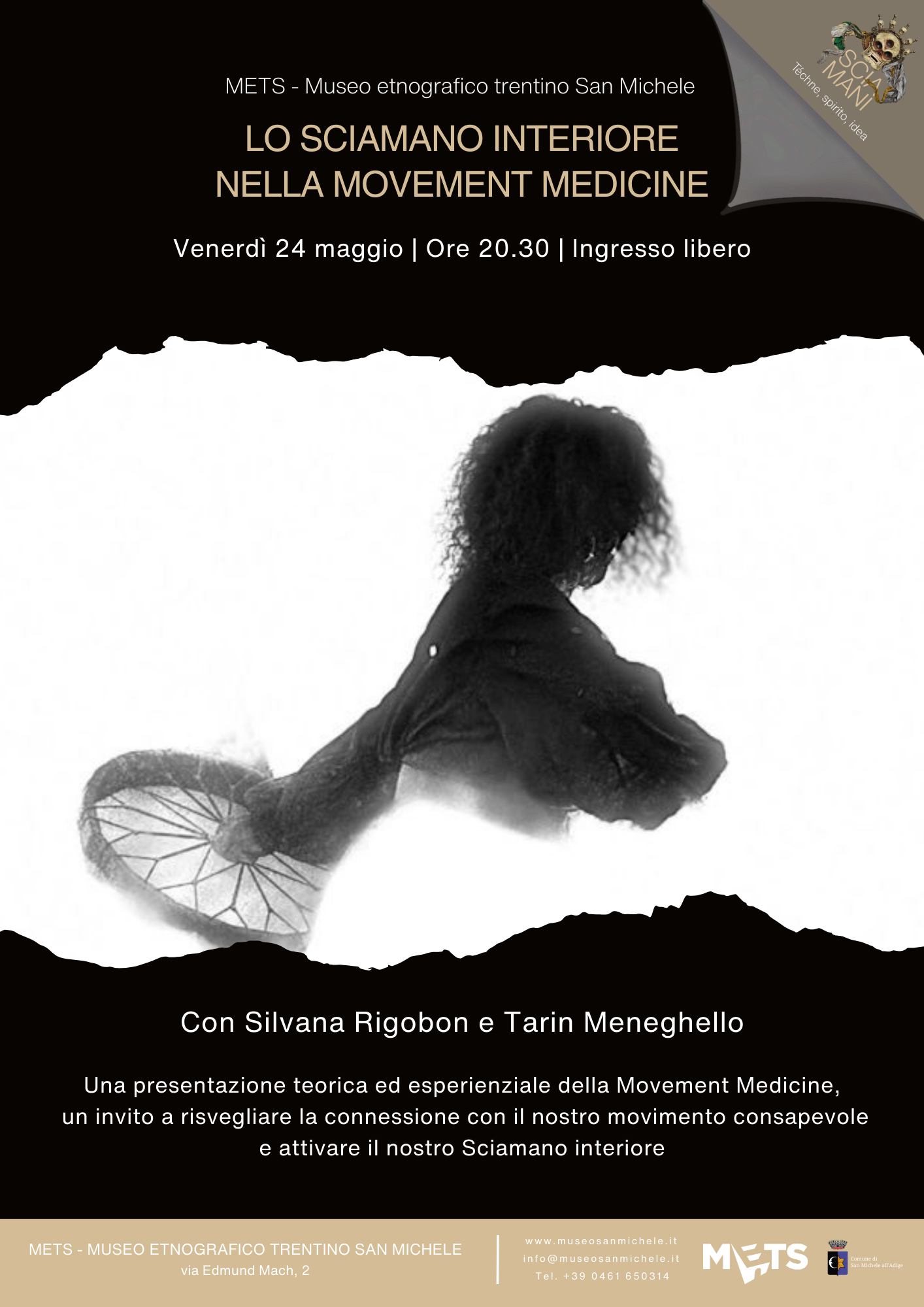È in programma dal 23 al 25 maggio un convegno particolarmente significativo dedicato al progetto “Sciamani” che ha visto collaborare i tre musei provinciali - METS, MART e MUSE - con 4 sessioni di relazioni suddivise su due giorni. Il momento inaugurale però, il 23 maggio alle 18, prevede anche tre interventi introduttivi, a cura dei responsabili scientifici del convegno da Stefano Beggiora (Università di Venezia) e Lia Zola (Università di Torino) e di Massimiliano Mollona (Università di Bologna). Dopo un piccolo momento conviviale a partire dalle 20.30 ci sarà un evento “Drum Circle” proposto da Renato Sclaunich insegnante, poeta musicista, artista visivo. Il 24 maggio, venerdì alle 20.30, ci sarà invece, un viaggio esperienziale di riconnessione con i quattro elementi Terra, Fuoco, Acqua, Aria “Lo Sciamano interiore nella Movement Medicine” a cura di Silvana Rigobon e Tarin Meneghello. Il convegno e i due eventi serali sono a partecipazione gratuita.