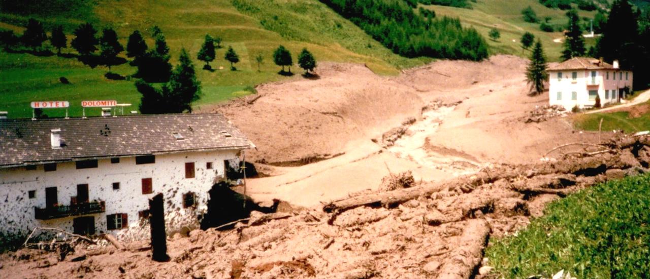 La tragedia avviene il 19 luglio 1985 alle 12,22 con il crollo dei due bacini di decantazione colmi di scorie minerarie. Una colata di fango violentissima investe sia la Val di Stava che via Mulini, nel paese di Tesero, con un bilancio di: 53 case, 6 capannoni, 3 alberghi abbattuti, tra questi l’albergo Miramonti all’epoca gestito dalle ACLI milanesi.