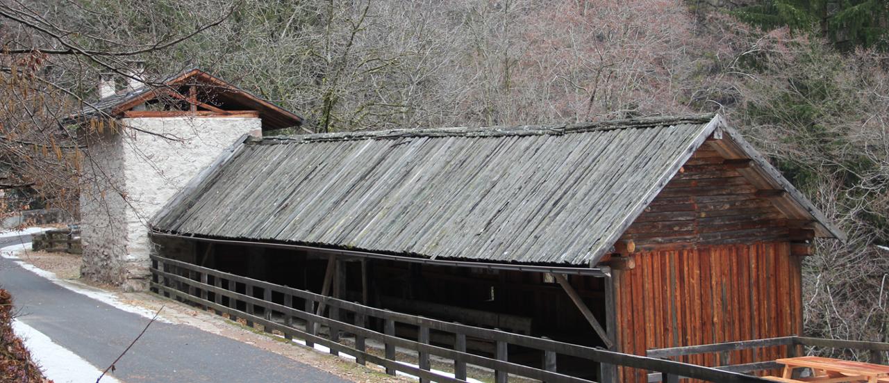 La prima parte del sentiero corre lungo il rio dei Molini, un affluente dell’Avisio che forniva un tempo l’acqua per far girare le ruote di una ventina di opifici. Oggi 3 di questi sono funzionanti, si tratta del mulino Cristofori, a Grauno, e della segheria Pojer Valentini (o sega Lontana) e della fucina Cristofori, a Grumes. Giunti a fondovalle, risalendo il pendio sull’altro versante, si trovano le calcare, il maso Pianaci e infine, a Piscine, la collezione De sti ani la memoria, che documenta le attività agrosilvopastoriali svolte un tempo dalle famiglie del paese: coltivazione dei cereali e della vite, fienagione, allevamento del bestiame, lavorazione del latte… In una valigia di ricordi sono conservati, tra le altre memorie, quaderni di scuola risalenti agli anni Trenta.